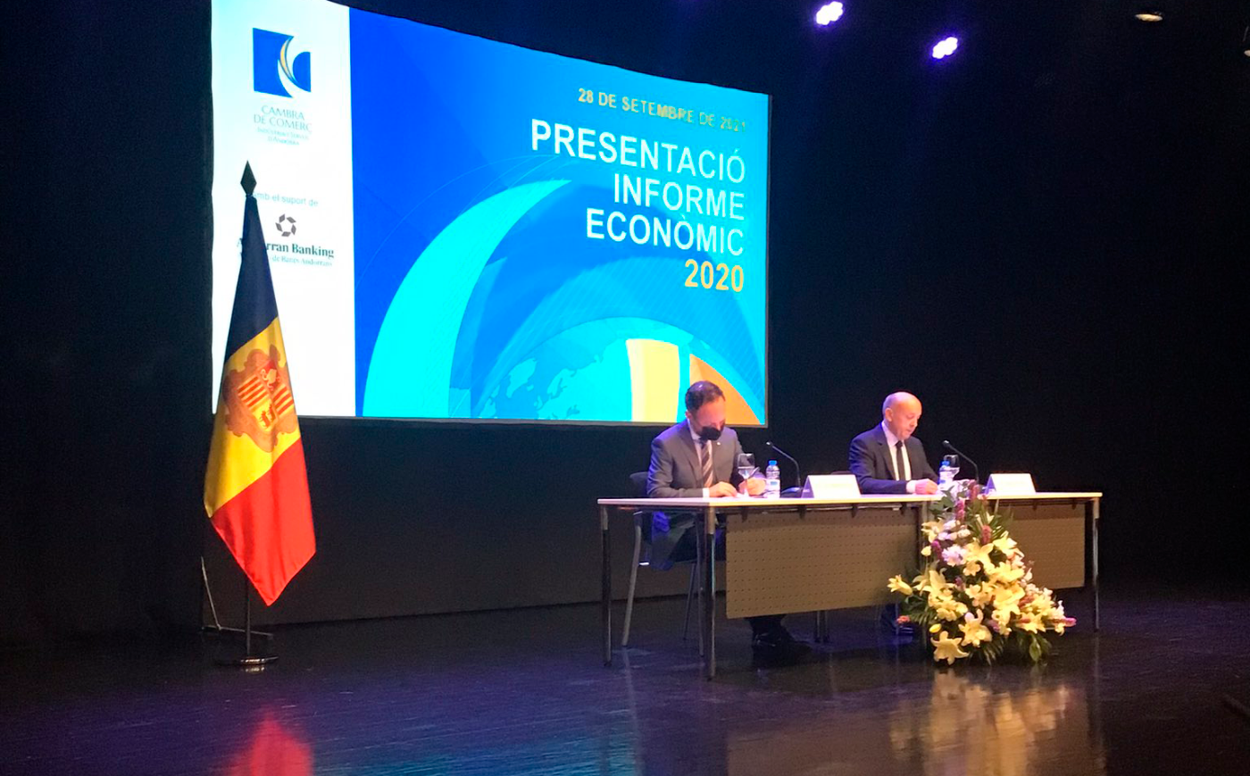 Josep Maria Mas, president de la Cambra de Comerç, Indústria i Serveis (CCIS), ha presentat avui els resultats de l’informe econòmic del 2020 en un acte que ha comptat amb la presència de Xavier Espot, cap de Govern d’Andorra.